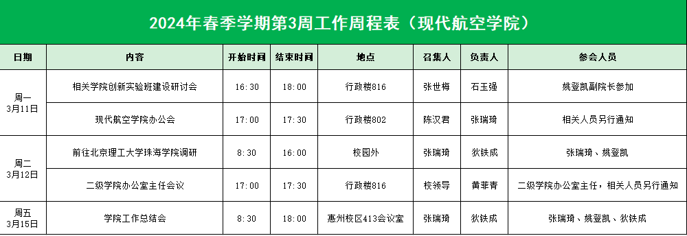 现代航空学院2024年春季学期第3周工作周程表