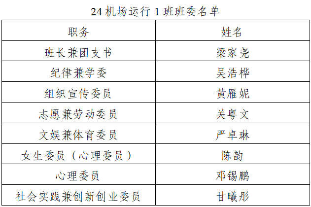 根据现代航空学院班委选举规则,落实党团班一体化建设工作要求,本着公开、公平、公正的选拔原则,经学生自主申请,学院资格审核,召开班会班级内部公开选举,确定各年级班委选举结果名单,现予以公示: