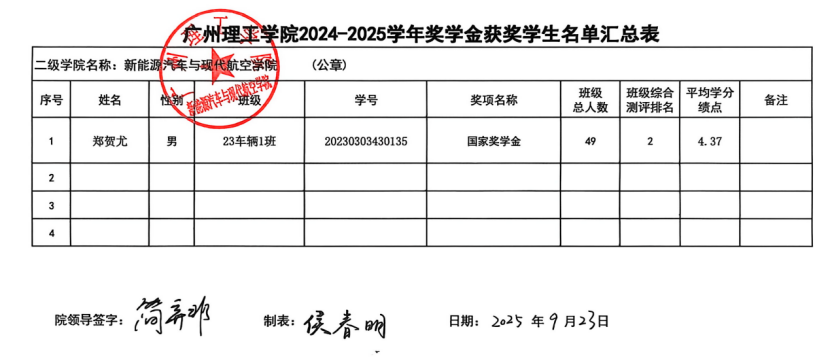 根据《广州理工学院关于印发〈学生资助工作管理办法〉的通知》(广州理工〔2025〕258号),新能源汽车与现代航空学院本着公平、公正、公开的原则对奖学金申请材料进行严格评选,现对学院2024-2025学年奖学金拟获奖名单予以公示。公示时间从2025年9月23日至2025年9月25日。