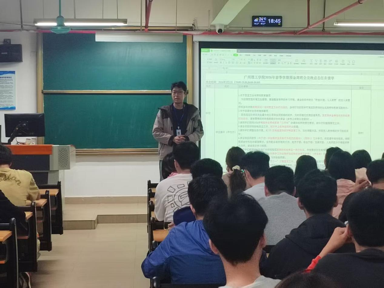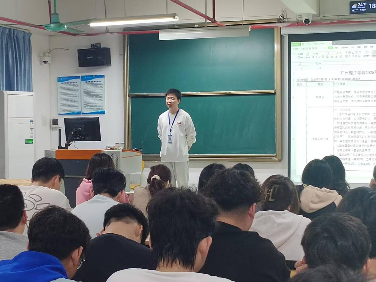 同时,结合本科合格评估的标准要求,张院长再次重申“手机入盒、专注课堂”的课堂纪律,号召全体同学以校园主人翁的姿态,主动配合学校迎评促建工作,自觉展现我院良好的学风风貌。紧接着,班导师殷亮、陈幸子老师分别聚焦英语学习与学业规划两大重点,与同学们展开深入交流。两位老师鼓励大家早做准备、积极备考大学英语四级考试,在日常学习中注重积累、夯实基础,科学合理规划学习任务,以高效的学习方法争取学业优异成绩。最后,辅导员侯春明老师围绕校园日常管理提出三点注意事项:一是保持宿舍卫生清洁,营造整洁生活环境;二是遵守课堂文明规范,做到手机入袋、不带早餐或零食进课室;三是维护公共秩序,严禁在公共场所吸烟,打造无烟校园。