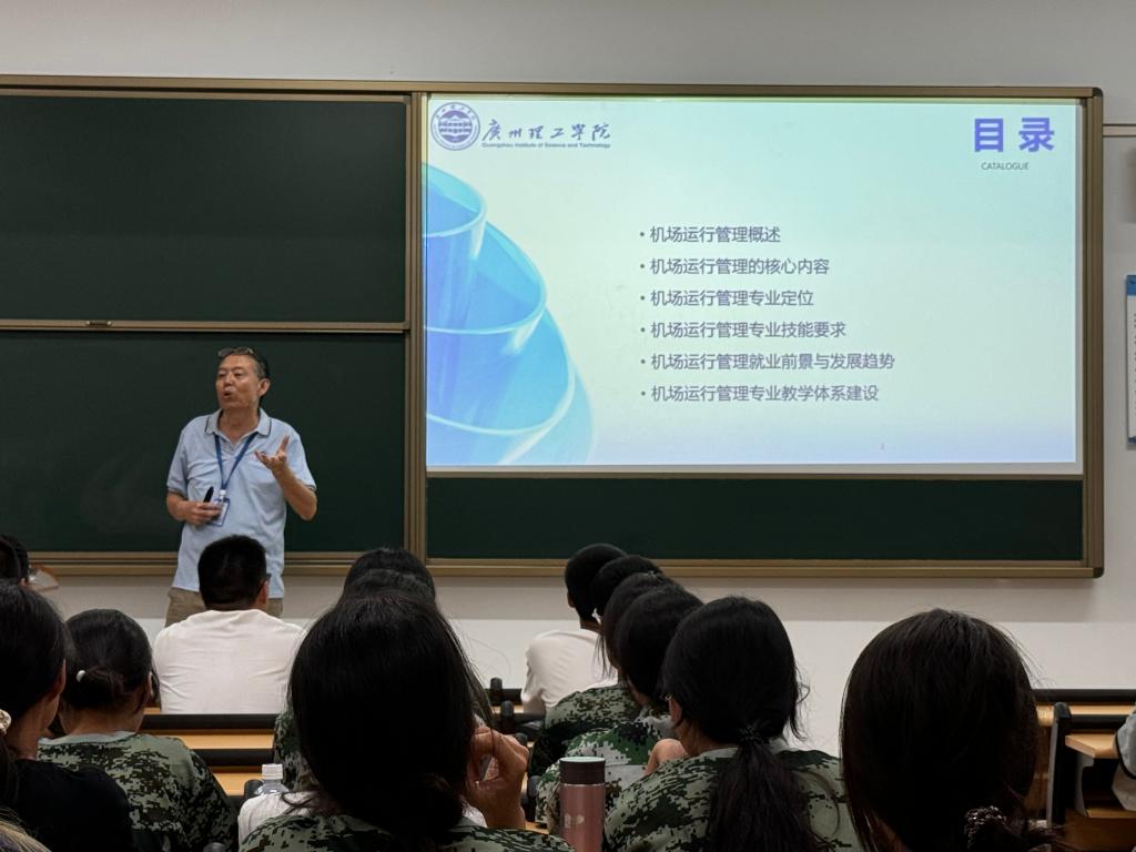 张秀军主任讲述了学校发展历程和交通运输(机场运行与管理方向)未来就业,让同学们从学校光辉的历程中汲取精神力量,以“学用心志 行知诚明”的校训勉励新生。