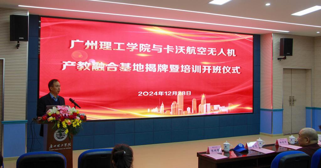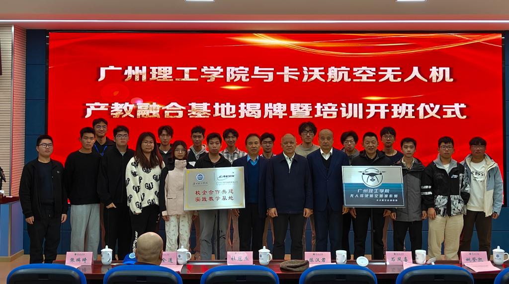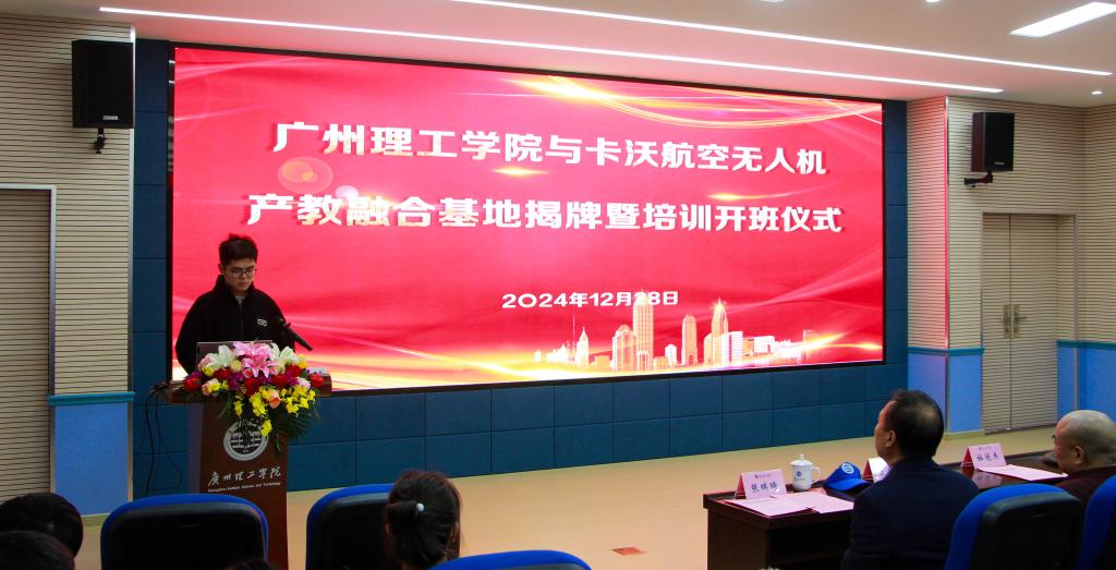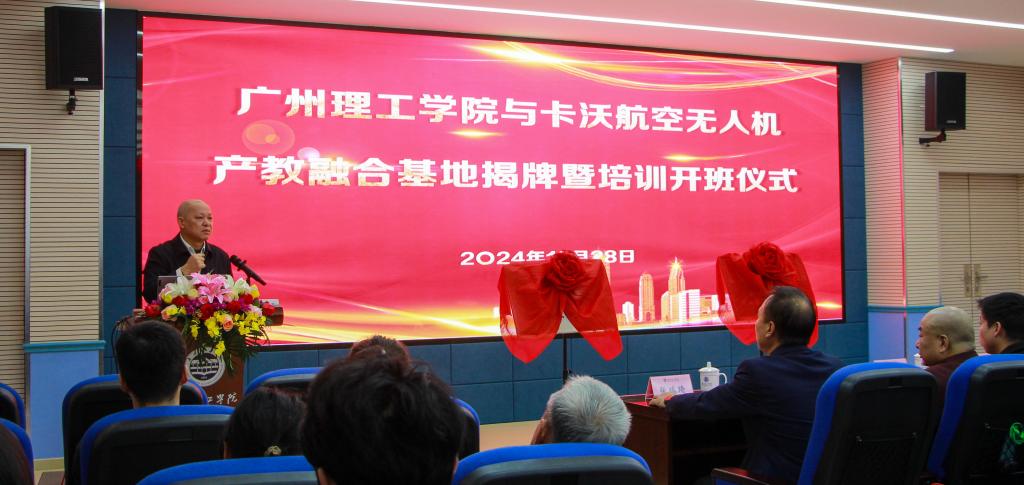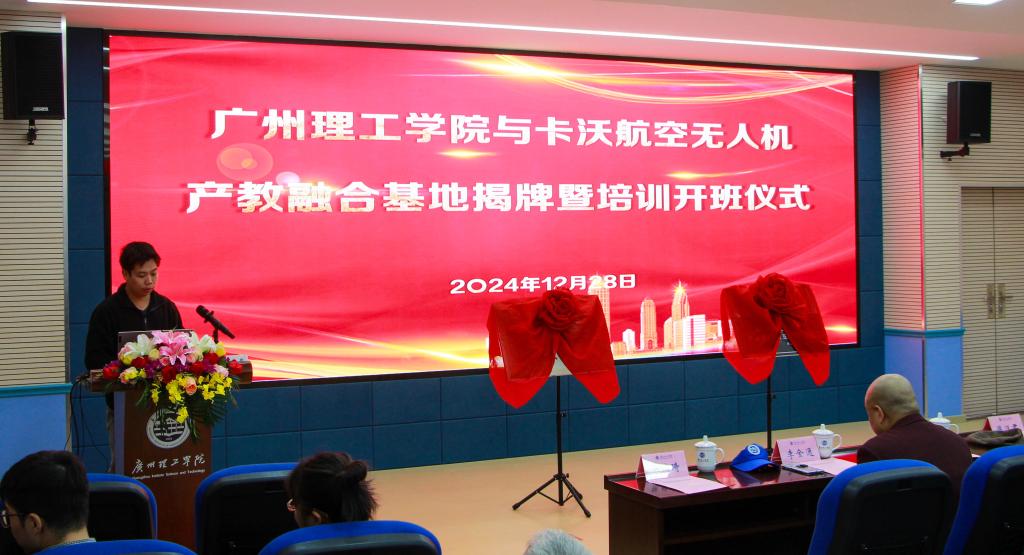 12月28日,广州理工学院与广州卡沃航空服务有限公司携手共建的无人机产教融合基地揭牌暨培训开班仪式在惠州校区204报告厅举行。广州卡沃航空服务有限公司总经理杜冠杰,我校副校长陈汉君、产教融合部部长石凤喜、现代航空学院全体教职工及首批培训班学员参加了本次活动。