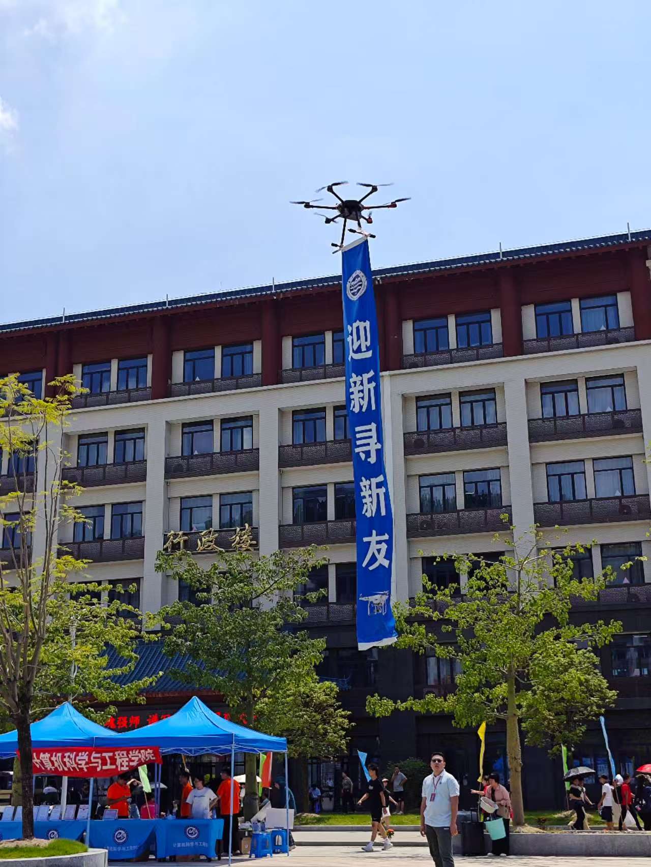 值得一提的是,在刚刚结束的“第27届中国机器人及人工智能大赛”广东省选拔赛中,我院荣获国家级一等奖和二等奖的两支团队核心骨干成员,也带着他们的作品,加入到了我们迎新活动的展示中来。本次迎新的最大亮点是“无人机先锋工作室”的现场首飞展示。工作室成员在指导教师的率领下,成功完成多架无人机的飞行演示,吸引大量新生及家长驻足观看。飞行表演不仅展示了学院在无人驾驶航空器领域的实践成果,也激发了新生对专业学习的浓厚兴趣,成为迎新现场一道亮丽的风景线。