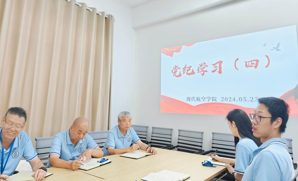 5月23日下午,现代航空学院在惠州校区行政楼413会议室集中学习《中国共产党纪律处分条例》(以下简称《条例》),推动学院党纪学习教育走深走实。学院院长张瑞琦主持会议。