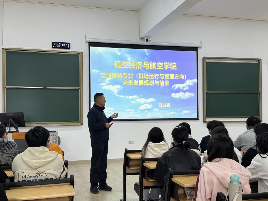 讲座现场,姚登凯副院长首先系统梳理了学院自2024年成立以来的发展脉络,随后围绕专业培养定位、课程体系构建以及“三阶段成长路径”展开详细解读。他结合粤港澳大湾区机场群建设提速、低空经济蓬勃发展的国家战略背景,深入剖析了机场运行与管理领域人才的两大发展通道——管理通道与技术通道的广阔前景,并着重指出,未来行业对兼具“智慧运行、低空协同、安全合规”能力的复合型人才存在迫切需求。