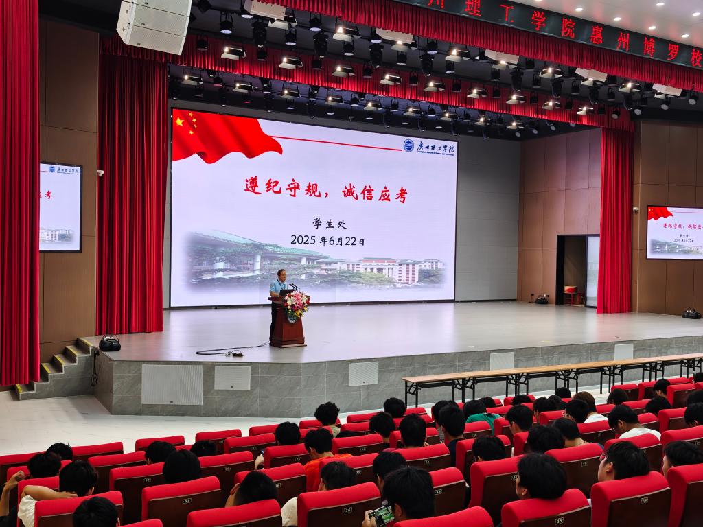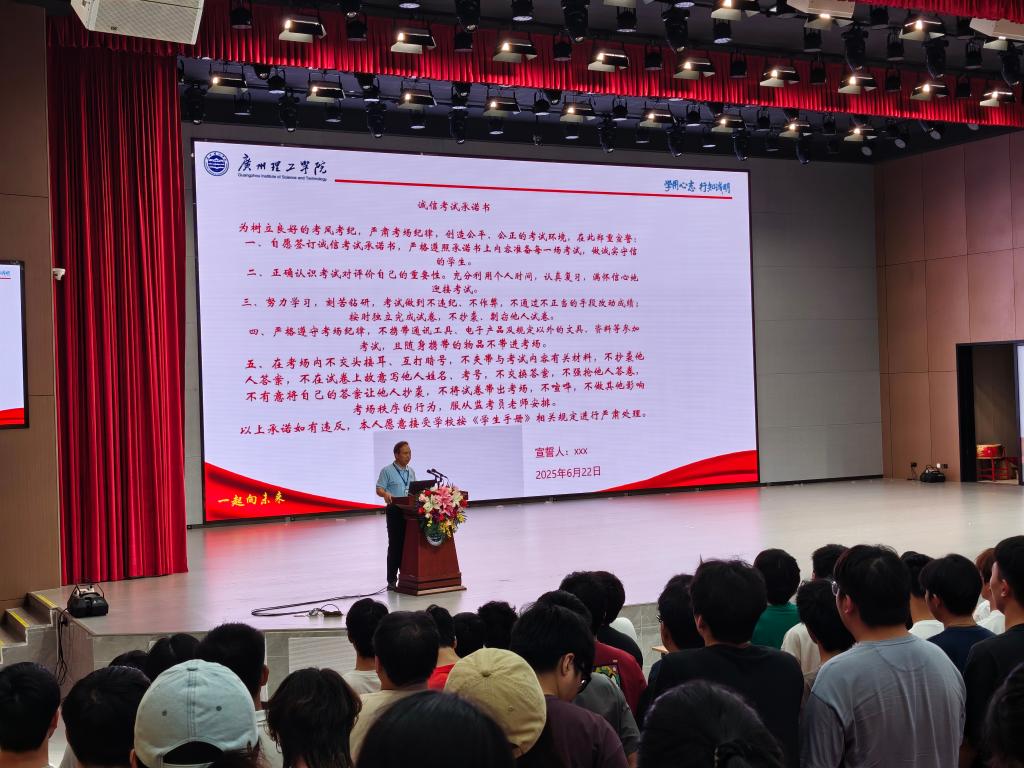 为严肃考风考纪,筑牢诚信考试防线,6月22日晚,新能源汽车与现代航空学院在惠州博罗校区大礼堂开展“零容忍,零作弊,在行动”特别主题班会,组织全体学生重温考试诚信承诺书,以实际行动弘扬诚信精神,营造风清气正的考试环境。