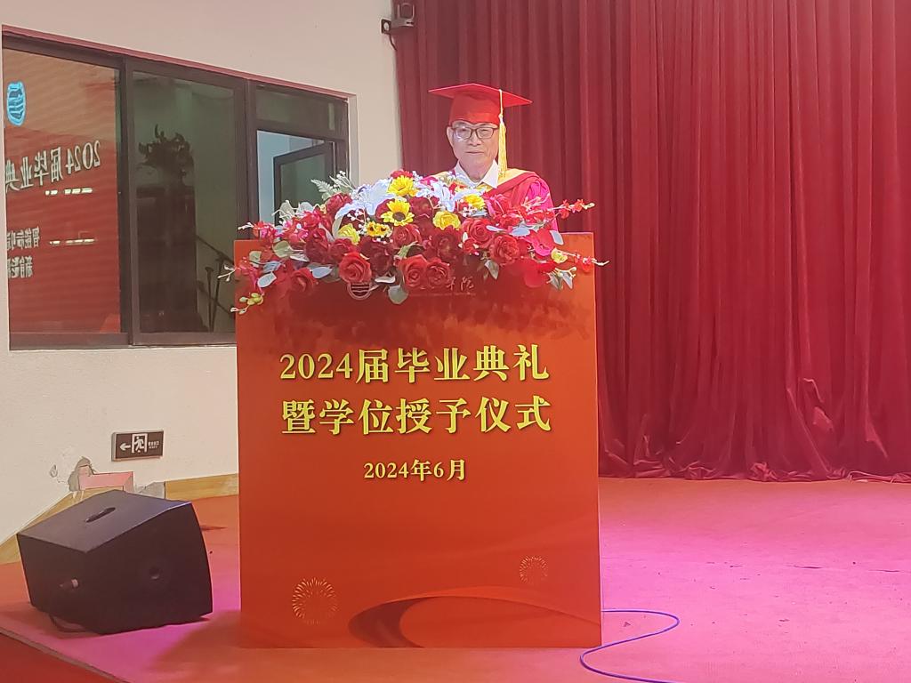 智电学院执行院长李玉忠教授致辞,向全体毕业生送上临别寄语和真挚祝福。李院长细数2024届毕业生四年大学生涯及取得的骄人成绩。为即将走出校门,走向社会的同学们提出三点希望,一是要把握国家大势,踏准国家发展的韵律,与国家的步调一致,才能实现人生目标的最大化。二是要学习,永远在路上,不学习无法跟上时代的步伐,希望大家关注人工智能和本专业的发展进步,只有不断学习新知识、新理论、新思想、新技术,才能有自己的创新,才能有工作成就,才能有美好的未来。三是要踏实做事。人生其实是没有多少捷径的,看别人成功好像是偶然,走到了捷径,其实都是一步一个脚印努力付出的结果。事实上,每个成功背后都是努力的汗水浇铸出的结果。他勉励同学们,南粤大地是国家与世界竞争高端制造业的一片热土,一片天空,一片海洋。李玉忠院长深情嘱咐毕业生:“虽然你们即将离开校园,但这里有你们奋斗的青春记忆,是你们梦想起航的地方,无论你们走到哪里,广州理工智电学院永远是你们最温暖的家!母校的大门永远为你敞开,欢迎大家常回家看看!”